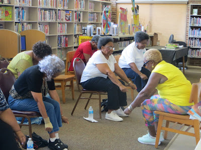 We had a wonderful exercise session at Wylam Library on this past Wednesday. Workout Wednesday with Ms. Myra was not the typical high impact aerobics thrashing and pounding of your joints; instead, low impact chair exercises were introduced. Ms. Myra made the session appealing with calming music, simple instructions, and practical information about exercising and health. Working out has not been a priority for me as of late and I had never thought much about this type of exercise.
