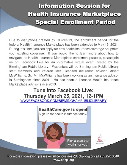 Details: Due to disruptions created by COVID-19, the enrollment period for the federal Health Insurance Marketplace has been extended to May 15, 2021. If you would like to learn more about how to navigate the enrollment process, please join us on Facebook Live for an informative virtual event hosted by the Birmingham Public Library. The information session presenters will be Birmingham Public Library staff members and local licensed insurance advisor, Albert McWilliams, Sr. McWilliams has been working as an insurance advisor in Birmingham since 2001. He has been a licensed Health Insurance Marketplace Advisor since 2013.