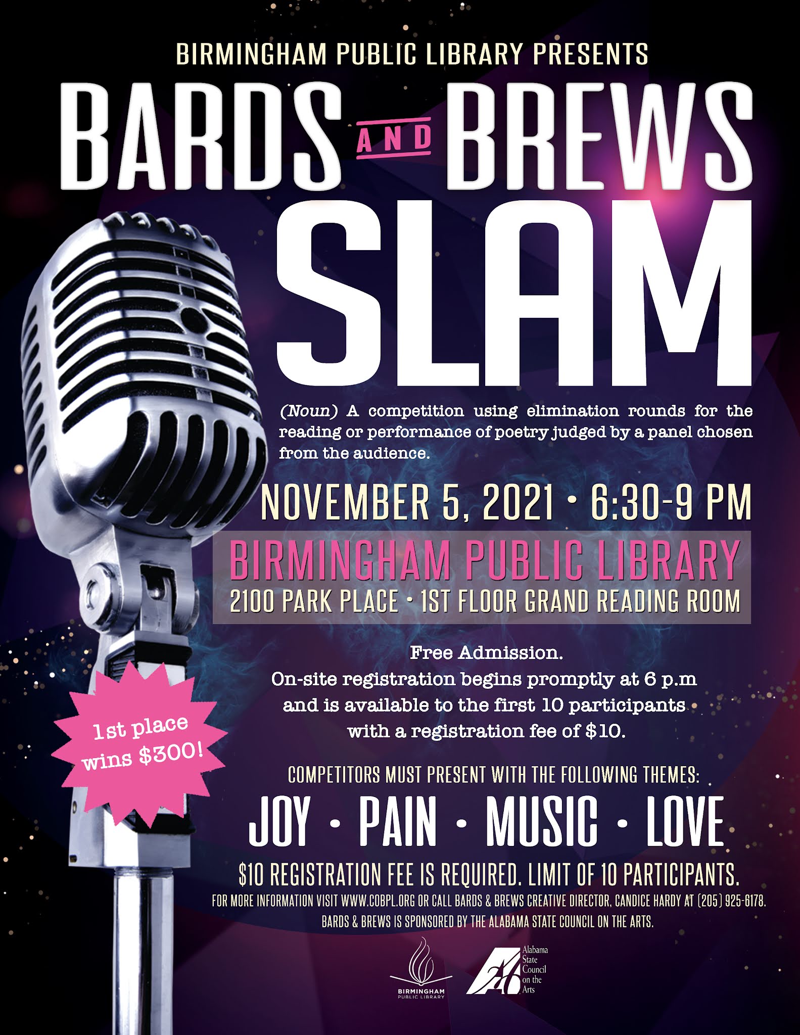 If you want to hear some of Alabama's most talented spoken word artists, join us at the Central Library on Friday, November 5, as the Birmingham Public Library hosts a Bards & Brews Poetry Slam.